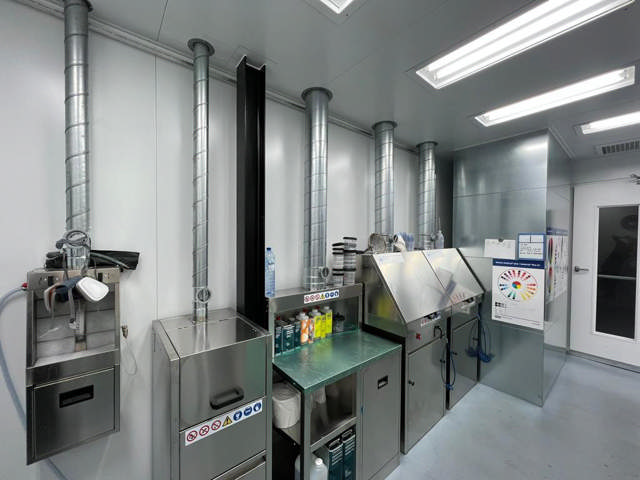 A range of Hamach products were used to fit out the mixing room. A Hamach stainless steel workbench with a built-in waste container was used to create a workplace, while the room also features a tailor-made waste area specially designed for disposing of paint. This disposal area is a liquid-resistant waste container for excess paint and thinners. Any remaining paint and thinners can be placed in the container upside down, and the container can then be closed to allow the liquids to flow into two tins below. All harmful fumes are removed through the exhaust duct. The HR 2400, HR 2000 and HR 1400 were selected for cleaning the paint guns.