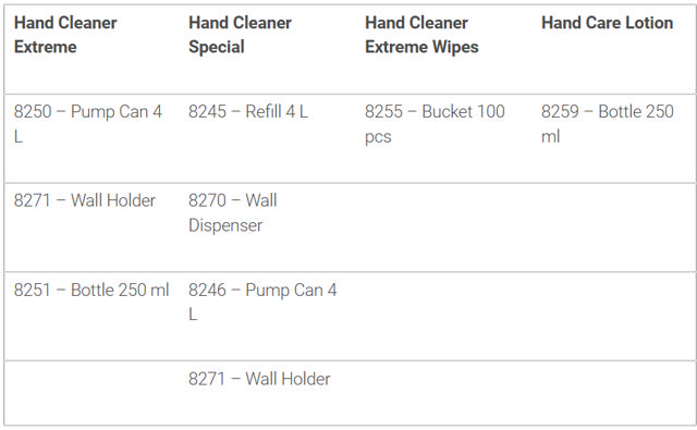 Over de verpakking is goed nagedacht. Beide versies worden geleverd in handige verpakkingen, zoals pompblikken die op werkhoogte aan de muur kunnen worden bevestigd, een voordelige wanddispenser en kleine en handige flessen.
